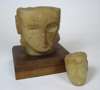 modelled with almond-shaped eyes above a carved mouth and nose, mounted on a wooden plinth, 16cm high overall; together with a smaller ALABASTER HEAD, with similar carved detail, unmounted, 7cm high (2)