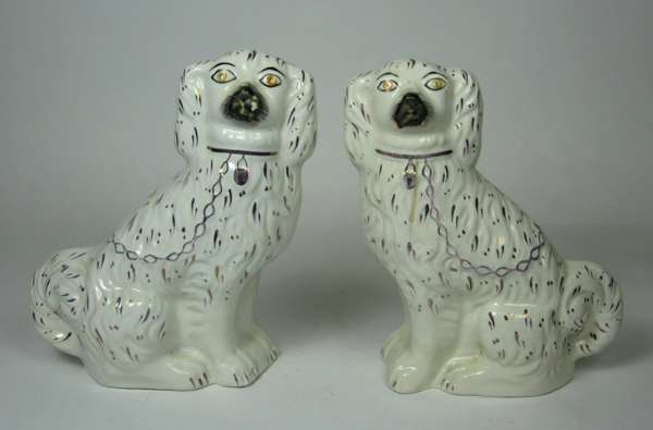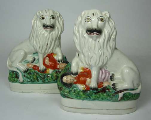 each modelled as a lion with a lifeless man in its paws, with polychrome and gilded decoration, 24cm high; together with a PAIR OF STAFFORDSHIRE POTTERY WALLY DUGS, with polychrome and lustre highlights, 24cm high (4)