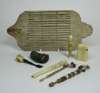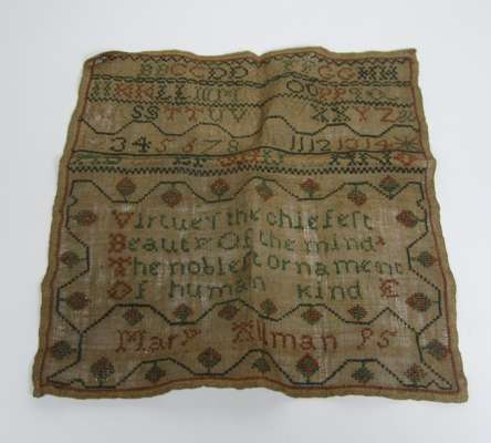 comprising: a needlework sampler, unframed; several carved ivory pieces, including a perenial calendar, the base modelled as a seal, various bobbins, and a other miscellaneous pieces; some items of treen; and a half shabti figure (qty)