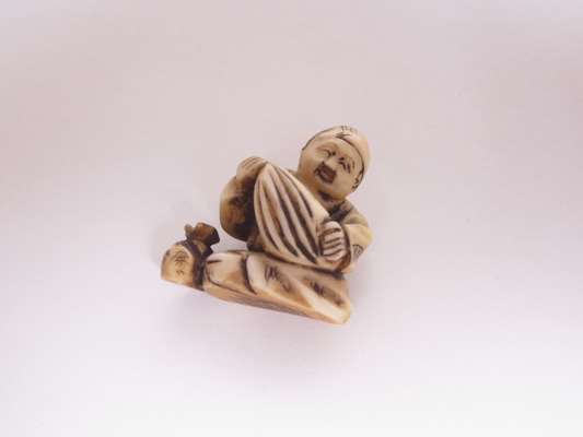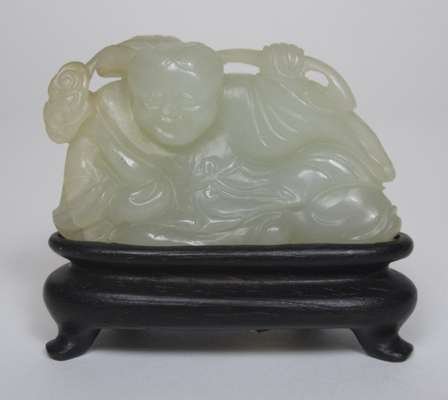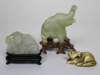 comprising: a jade figure of a recumbent man, with a hardwood stand, 5.5cm wide; a jade figure of an elephant, with a hardwood stand, 7cm high; a carved netsuke modelled as a seated man, 3.5cm high; and a netsuke carved as a horse, 5cm wide (4)