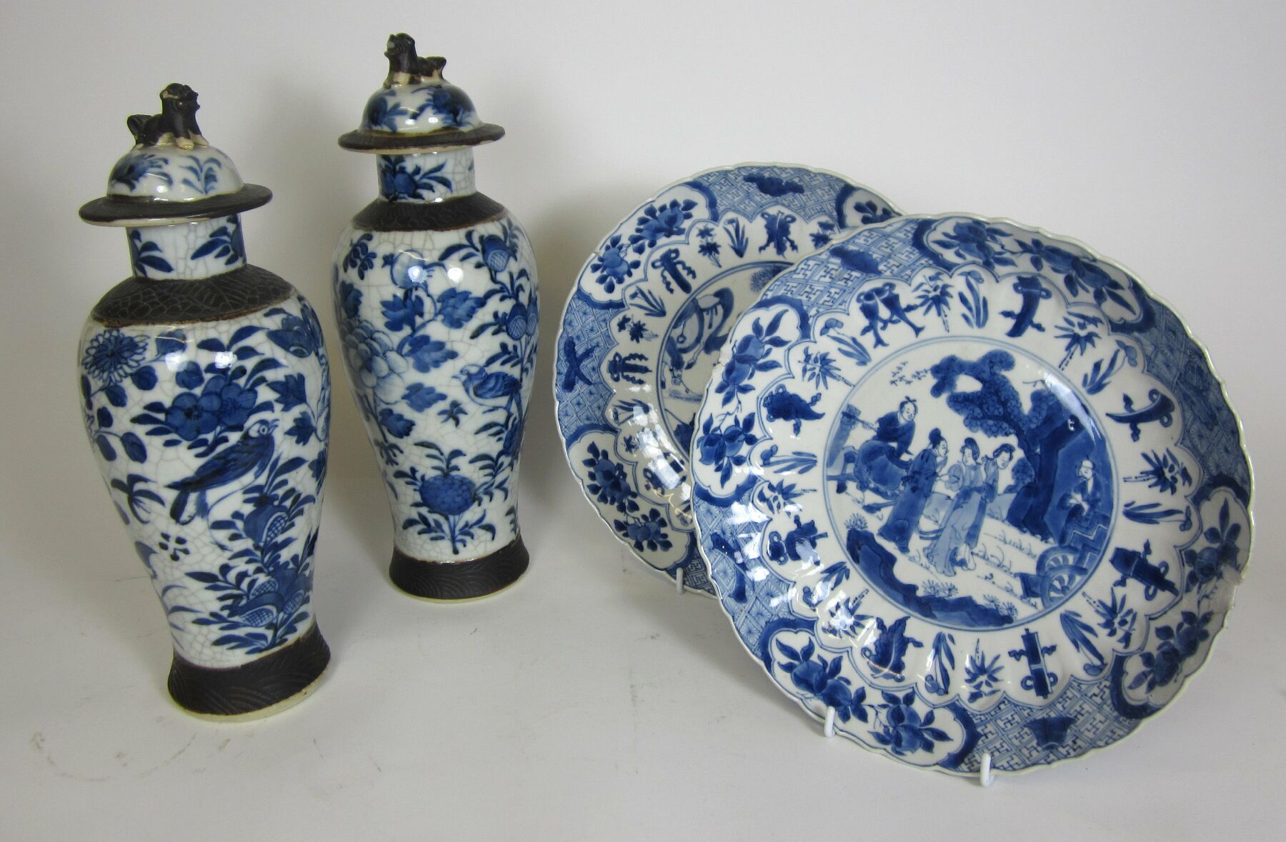 comprising: two stoneware vases and covers, each of baluster form, decorated with birds and flowers between unglazed borders, marks to underside, 32.5cm high and 31.5cm high; and two circular porcelain dishes, painted with figural scenes between decorative borders, marks to underside, 26cm diam (4)
