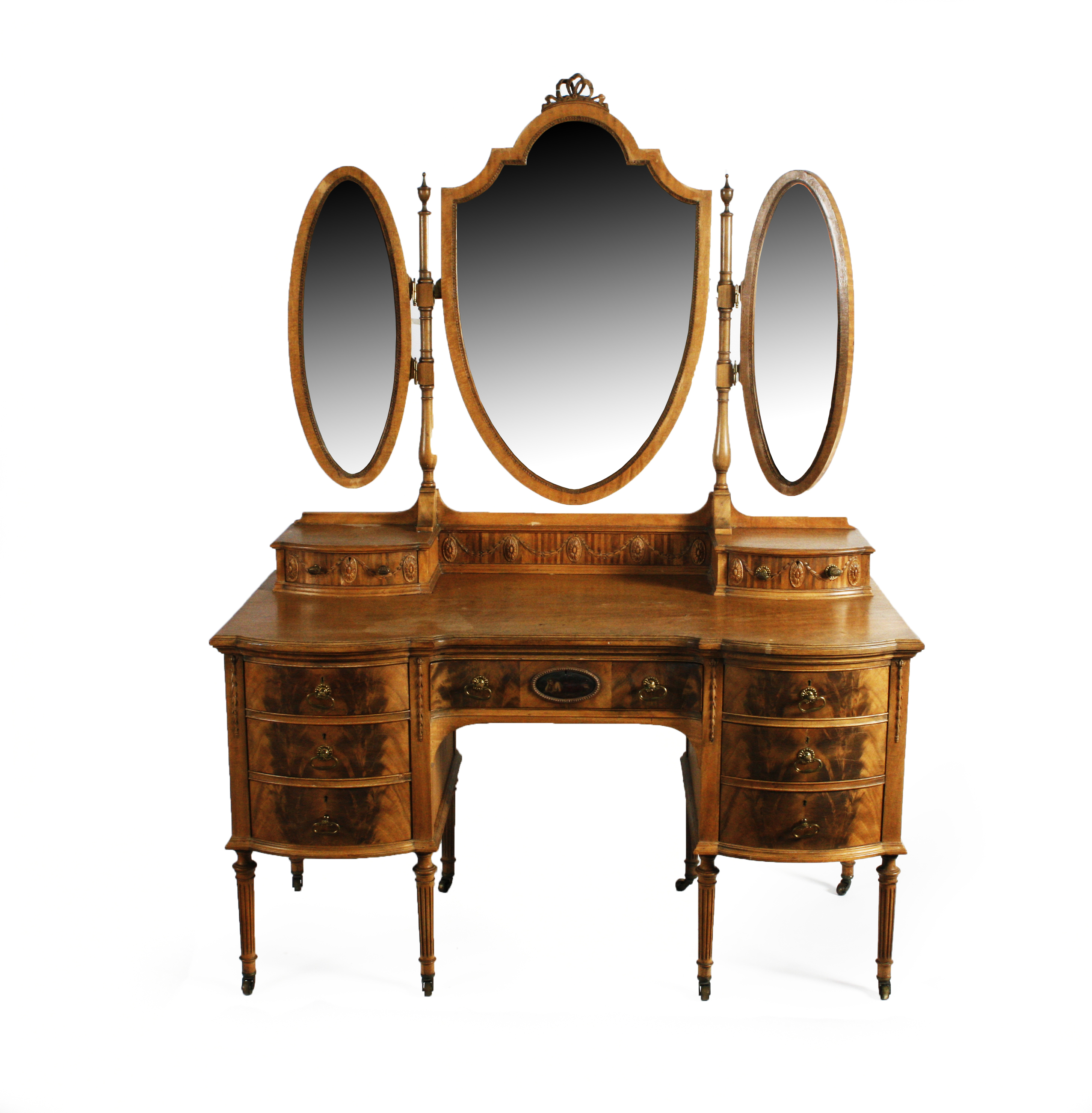 the central shield shaped mirror flanked by two further oval mirrors, above a moulded shaped top, over a single drawer, flanked on either side by three drawers, raised on turned fluted legs with brass caps and castors