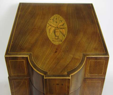 the first with inlaid banding and a marquerty panel to the lid, the interior fitted as a stationary box, 39cm high; the second of serpentine form with an inlaid panel to the lid and banding detail, the interior void, 35cm high (2)