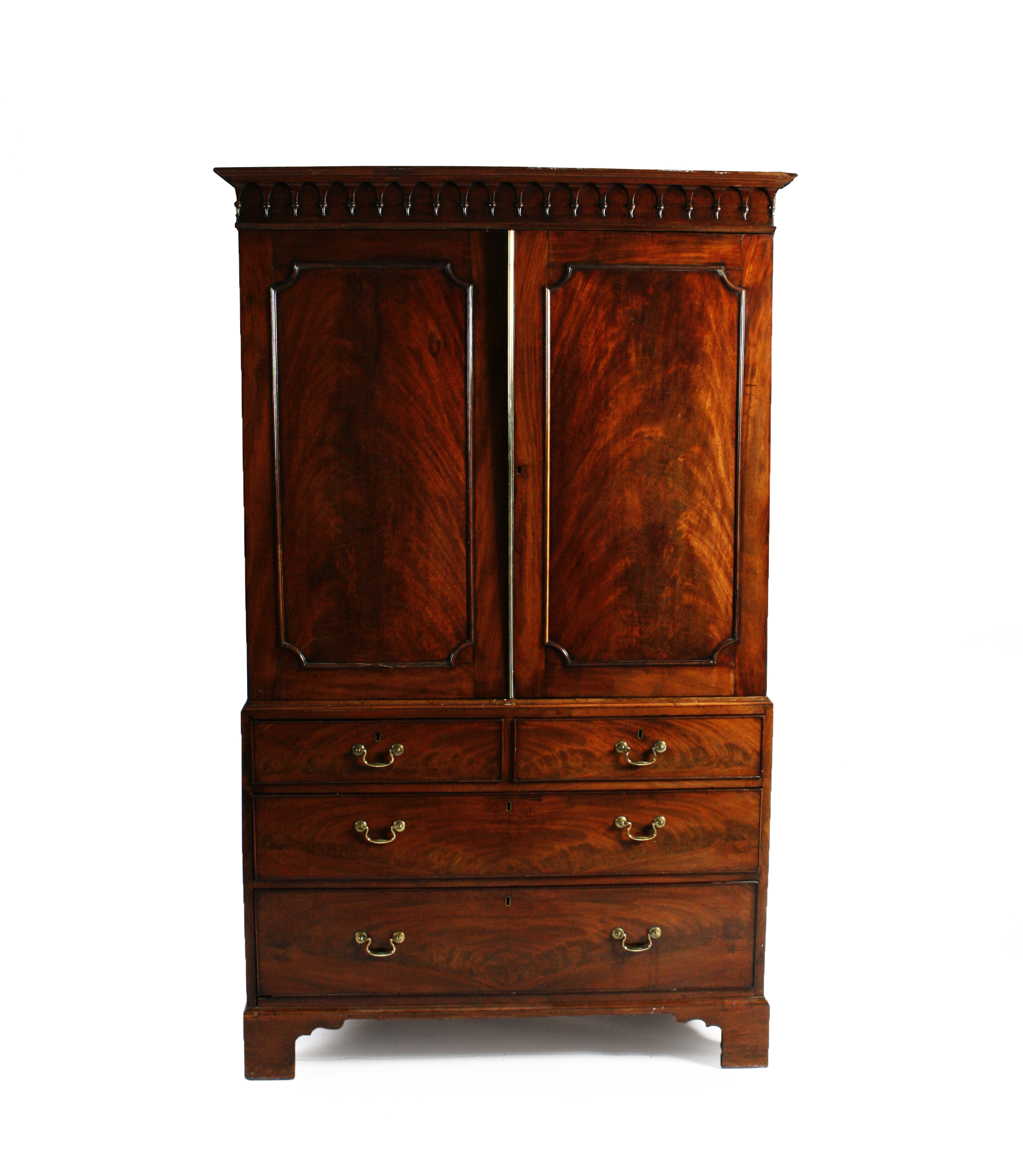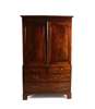 the moulded cornice above paneled doors, over two graduated long drawers, raised on bracket feet