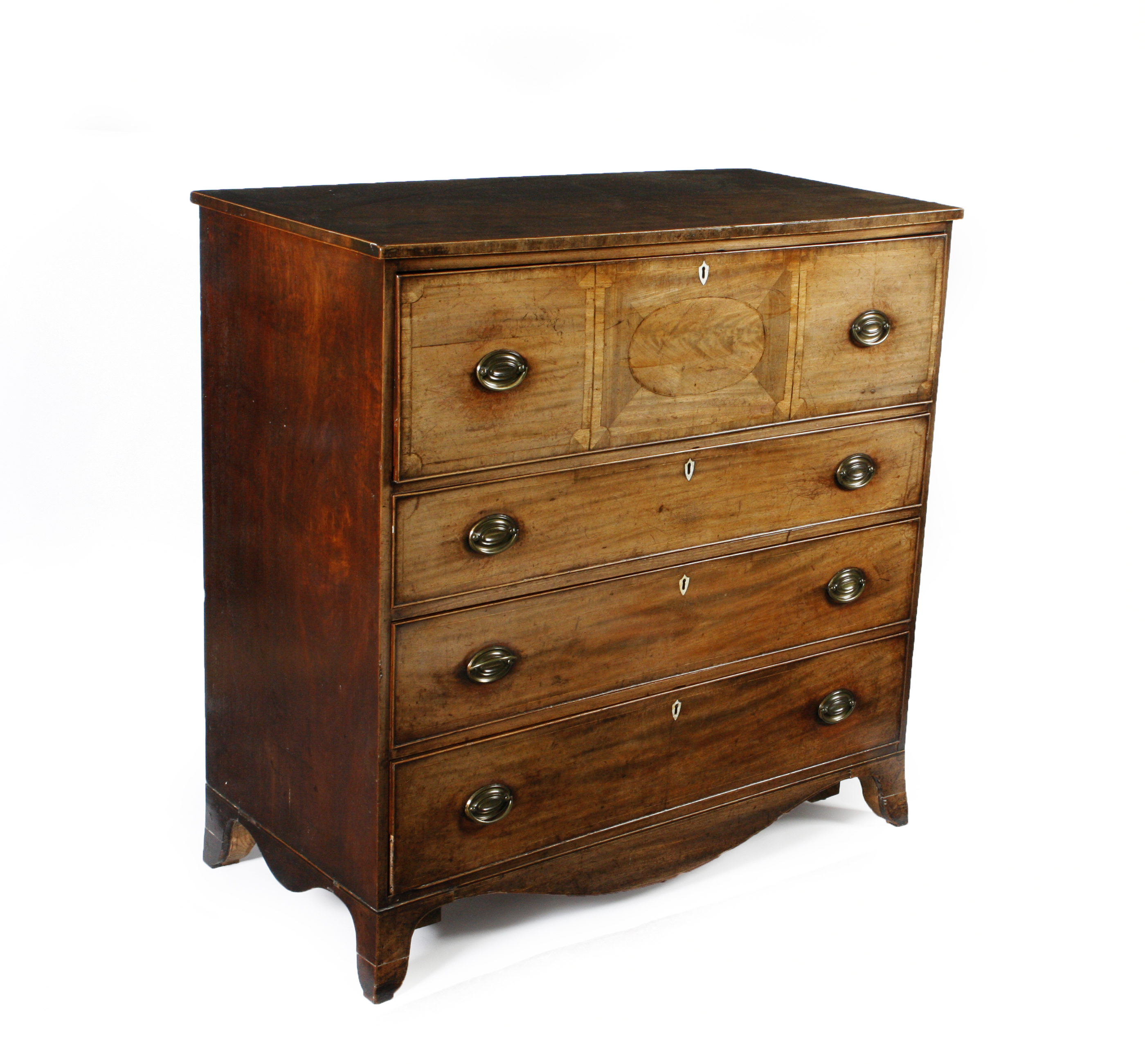 the rectangular top above one deep and three graduated long drawers, raised on bracket feet