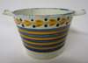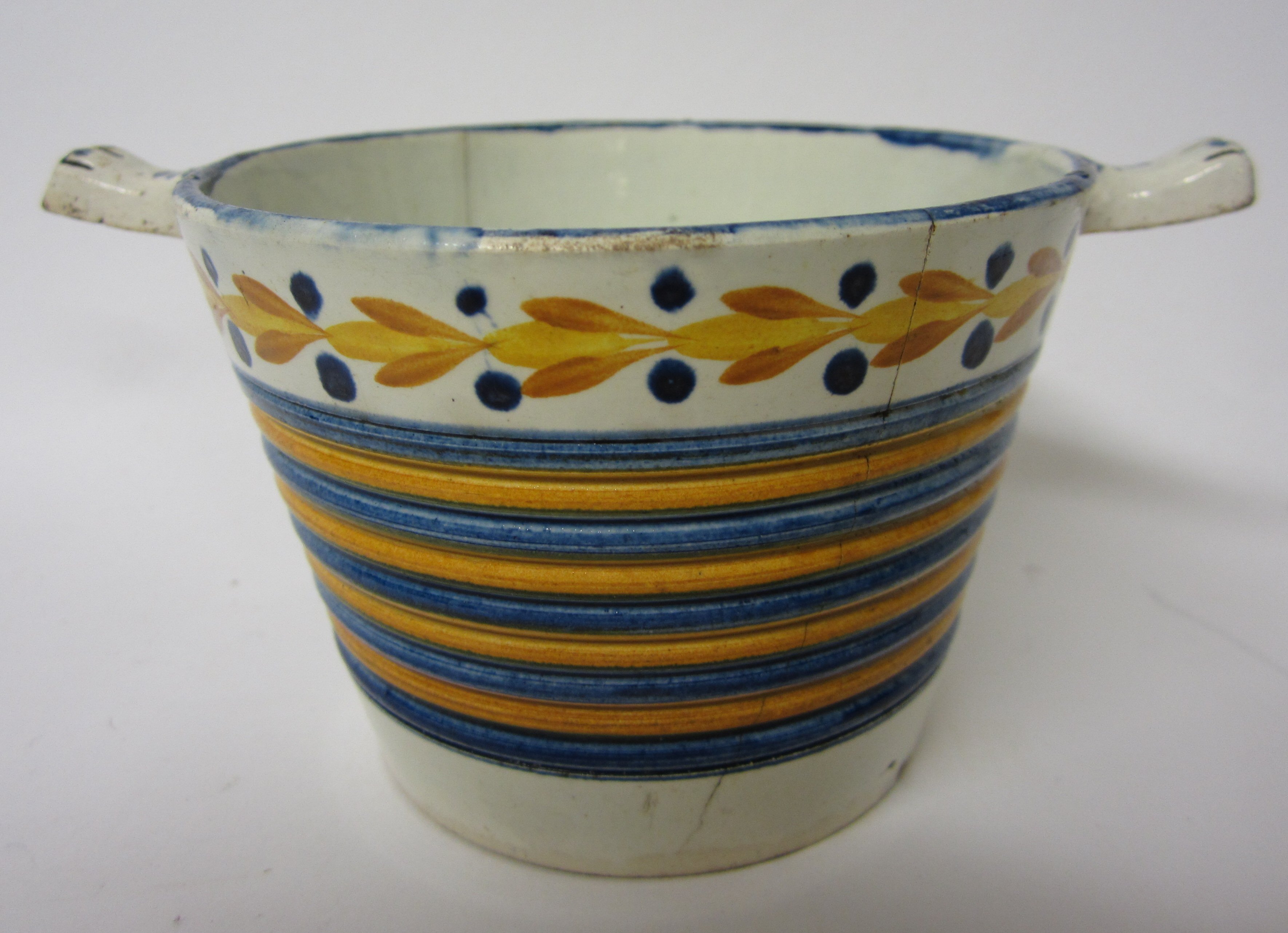 of cylindrical form with twin-handles, painted with blue and orange stripes and flowers, label to underside 'Patrick McVeigh, Pottery Rathbone, P. Ballo SAC.70, Circa 1815, No. 84'