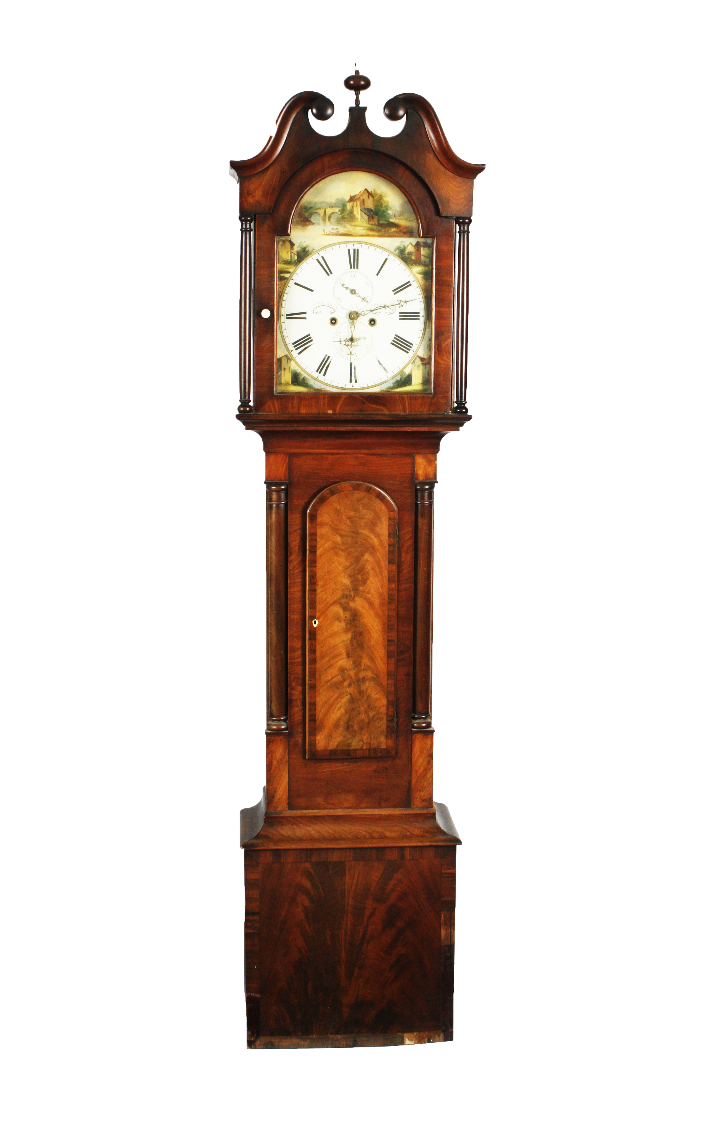 the painted dial with figures, Roman numerals, inscribed 'WM Andrew, Huntly', the broken swan neck pediment raised on turned columns, above a cross banded door, flanked by half pilasters, over a cross banded base