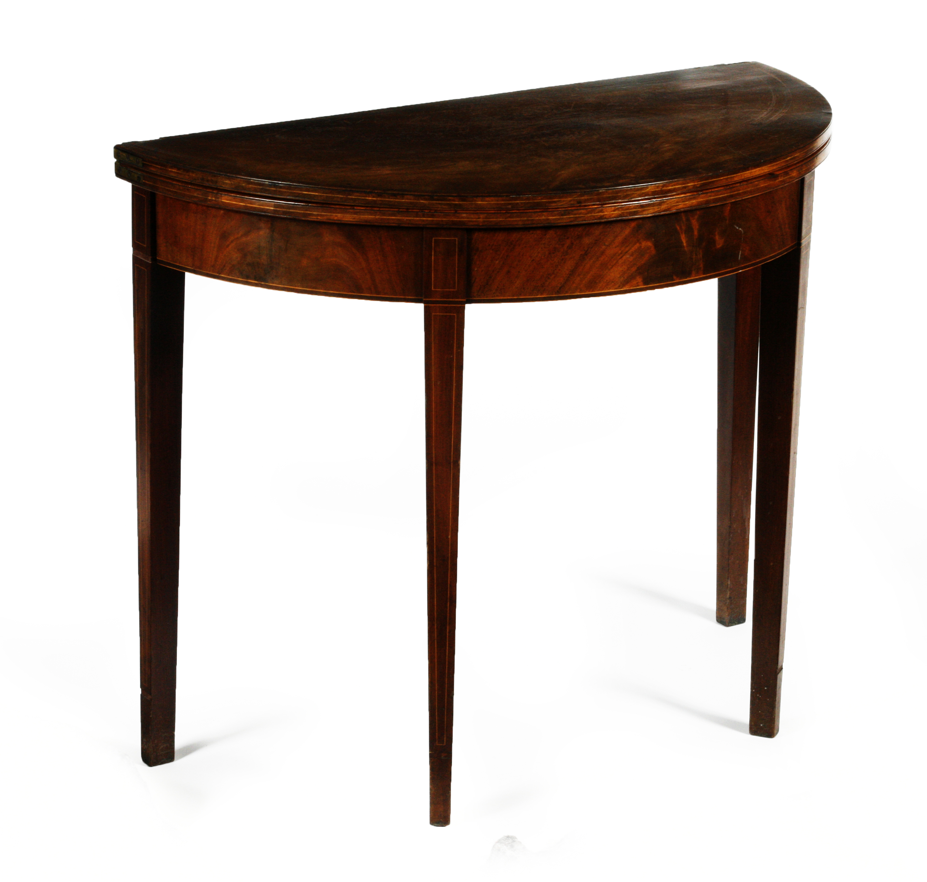 GEORGE III MAHOGANY DEMI LUNE FOLD OVER TEA TABLE