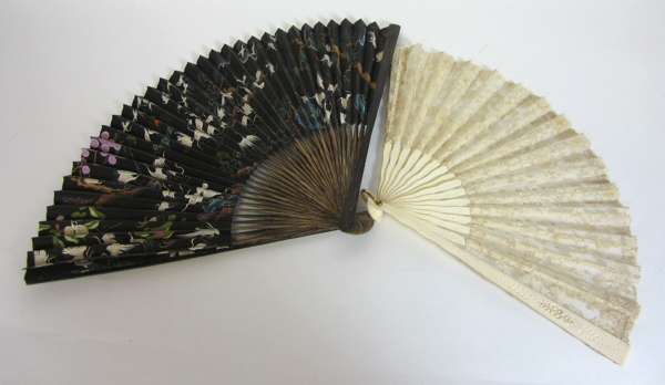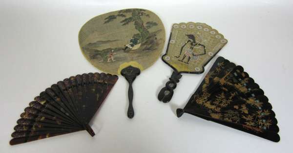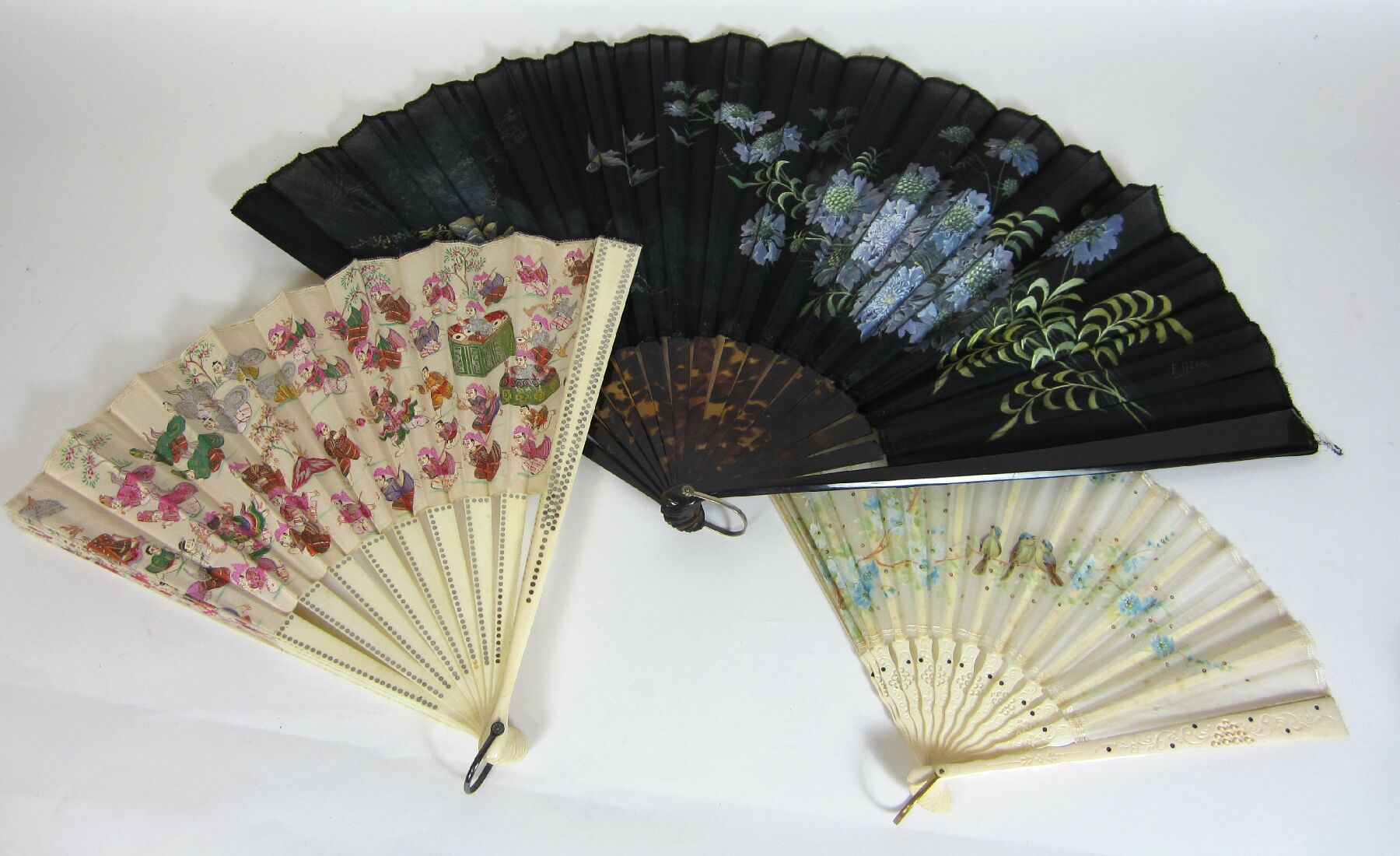 of various material, shape and size, including: a boxed Duvelleroy example, painted with polychrome figures; several Asian fans; various ivory mounted examples; a tortoiseshell fan; and a black lacquered fan with gilded decoration (9)