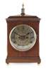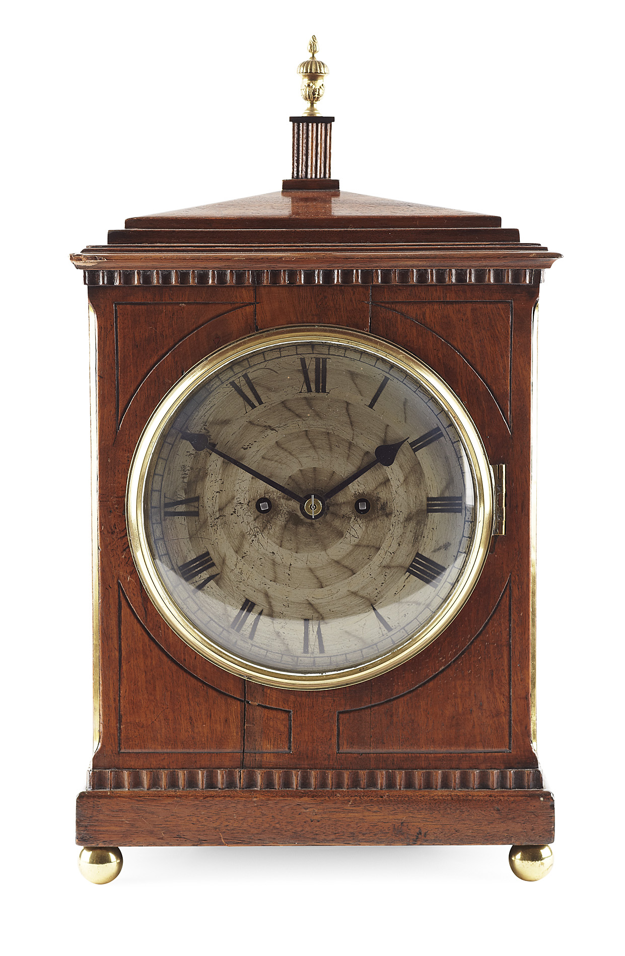 the panel domed top with a raised gilt metal urn finial over dentil moulded cornice and circular silvered Roman numeral dial with two winding holes, bell strike and brass grille insert side panels, raised on brass ball feet