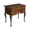 the rectangular top with a moulded edge and notched forecorners, above a long frieze drawer and arched kneehole, flanked by short drawers and raised on cabriole legs with pad feet