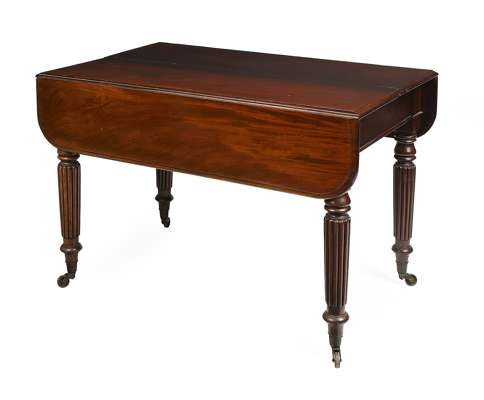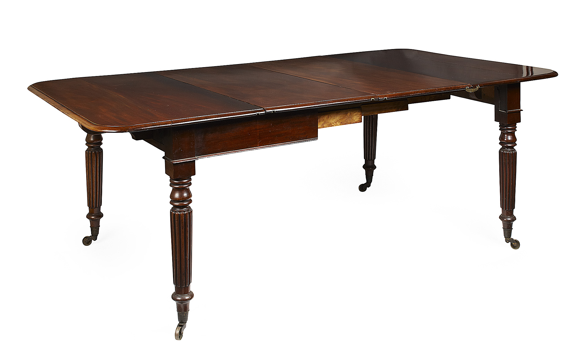 with rounded rectangular top with drop-down ends, raised on reeded and turned legs ending on brass caps and castors, with two leaf inserts