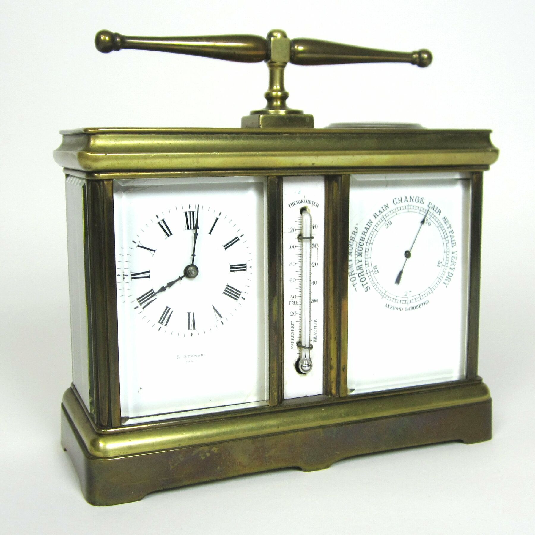 the white enamelled dials on either side of a central thermometer below a compass, the clock dial signed 'R. Stewart Paris'