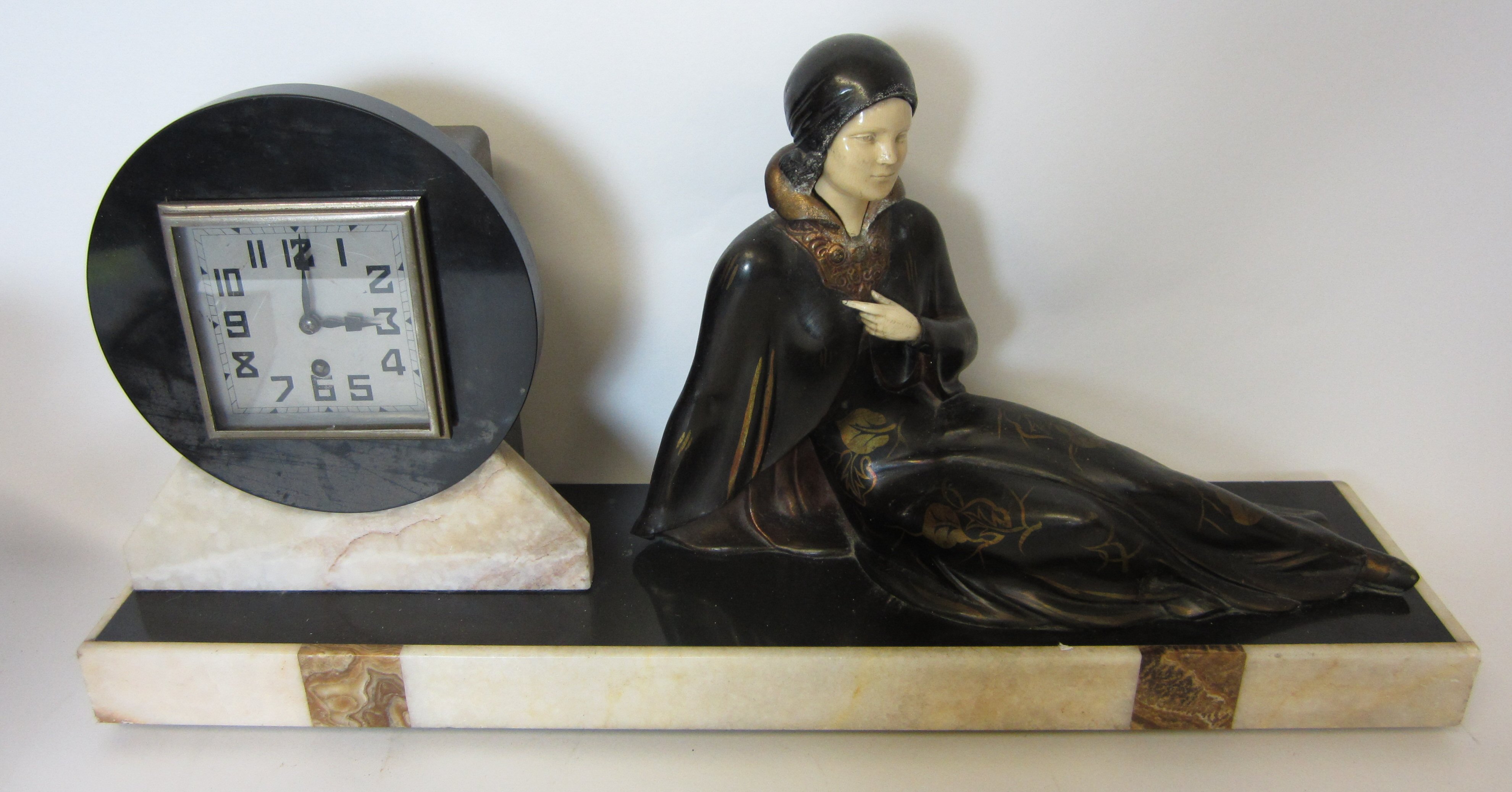 the square set dial with Arabic numerals beside a metal figure of a recumbant female, on a slate and onyx mounted plinth; the urns of fluted form, on similar square shaped plinths (3)