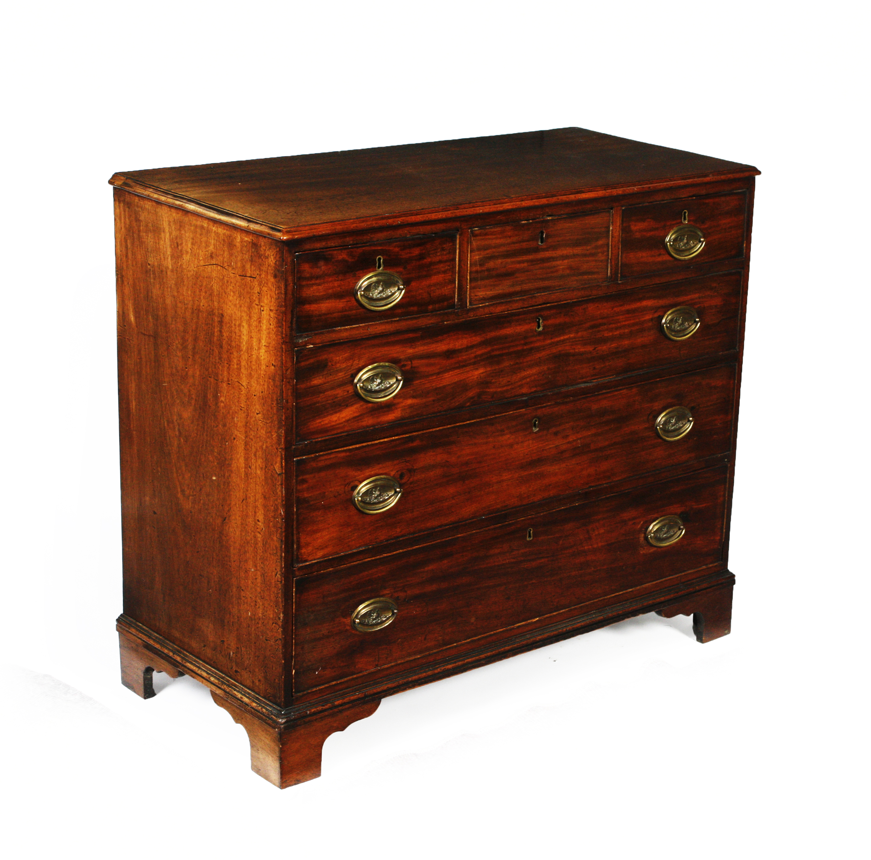 the moulded rectangular top above three short and three graduated long drawers, raised on bracket feet