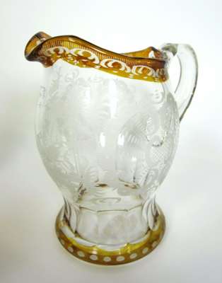 comprising of: 14 green hock glasses, with etched bowls and knopped stems, 19cm high; eight smaller hock glasses, with amber etched bowls and moulded stems, 12cm high; six etched and cut water glasses with amber borders, 10.5cm high; and a matching glass pitcher, 17.5cm high (29)