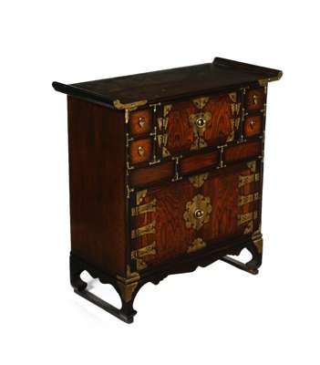 the shaped rectangular top above two cupboards, flanked on either side by two short drawers, above two further cupboard doors, raised on shaped block feet, united by stretchers, the whole with applied brass mounts