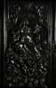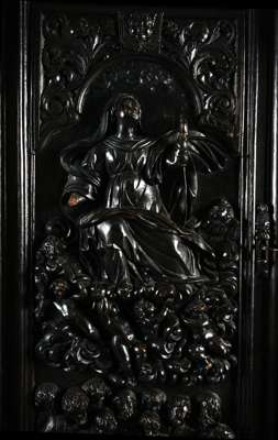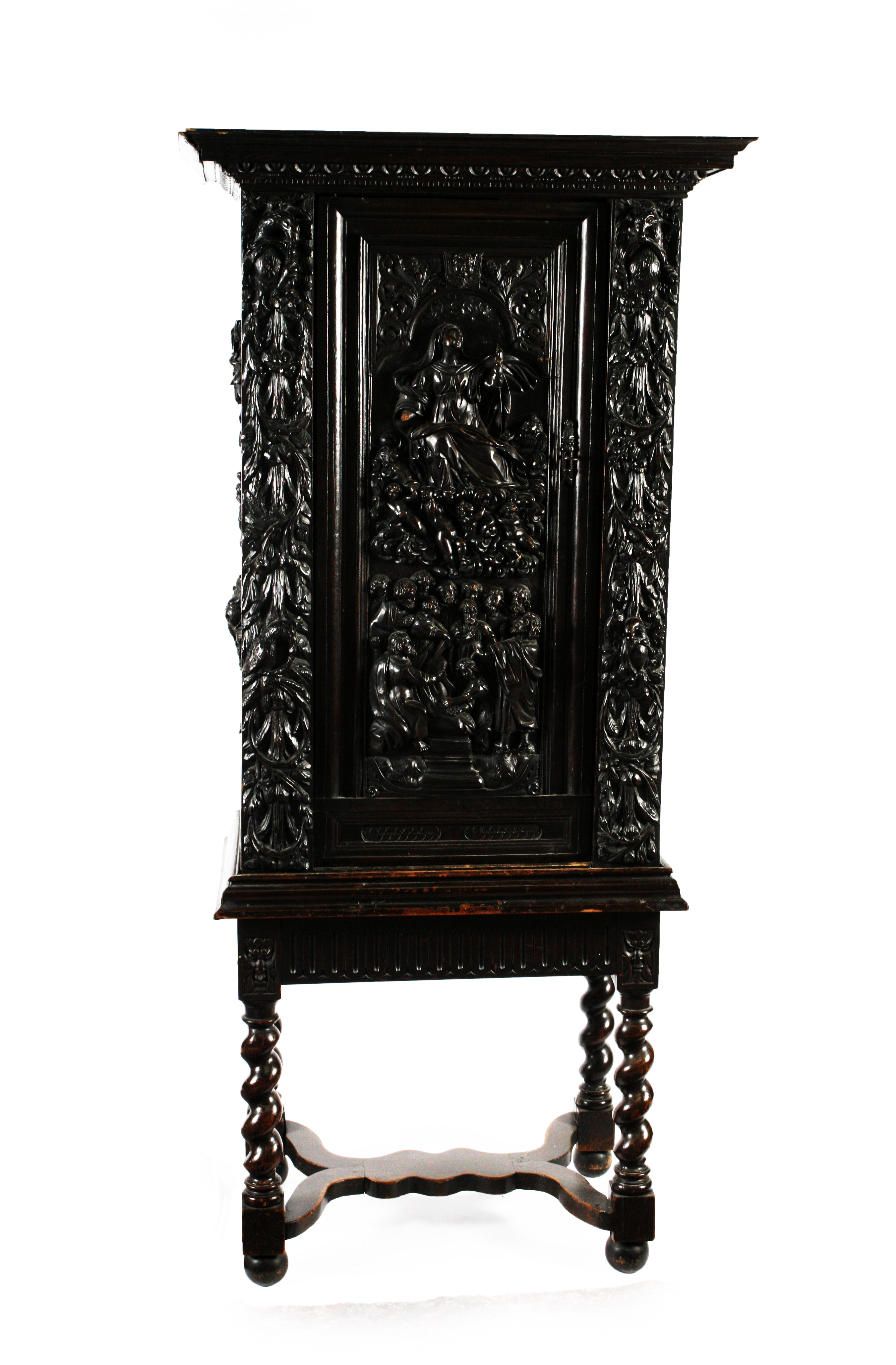 the moulded cornice above a carved door depicting a biblical scene, flanked by carved panels, raised on spiral turned legs and bun feet, united by stretchers