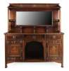 with marquetry inlay, the mirrored back with open shelves and slatted sides above a bowed top and arrangement of three drawers with two panelled doors below around a void, the whole raised on square tapered legs