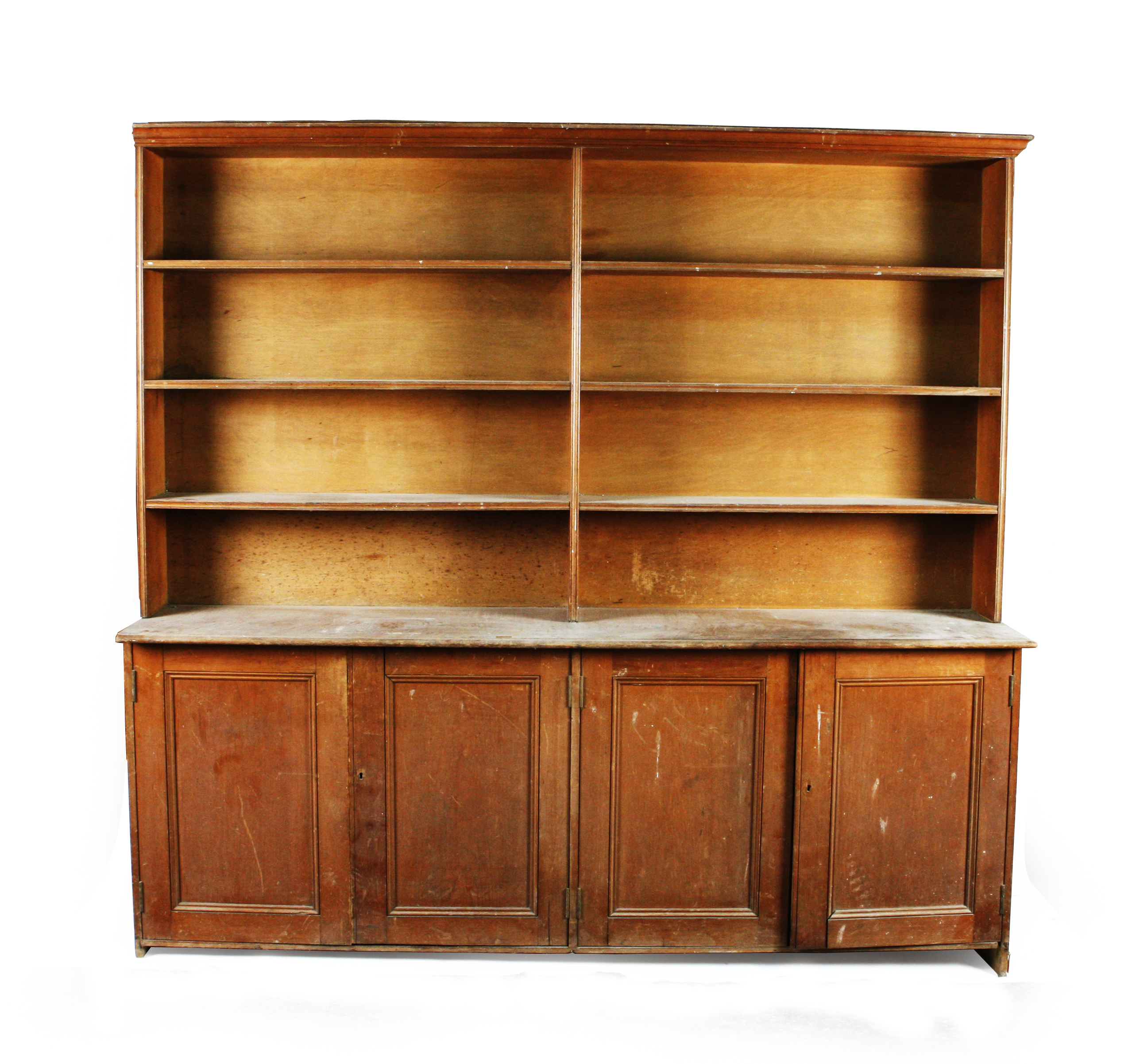 the moulded cornice above open shelves, over four paneled doors
