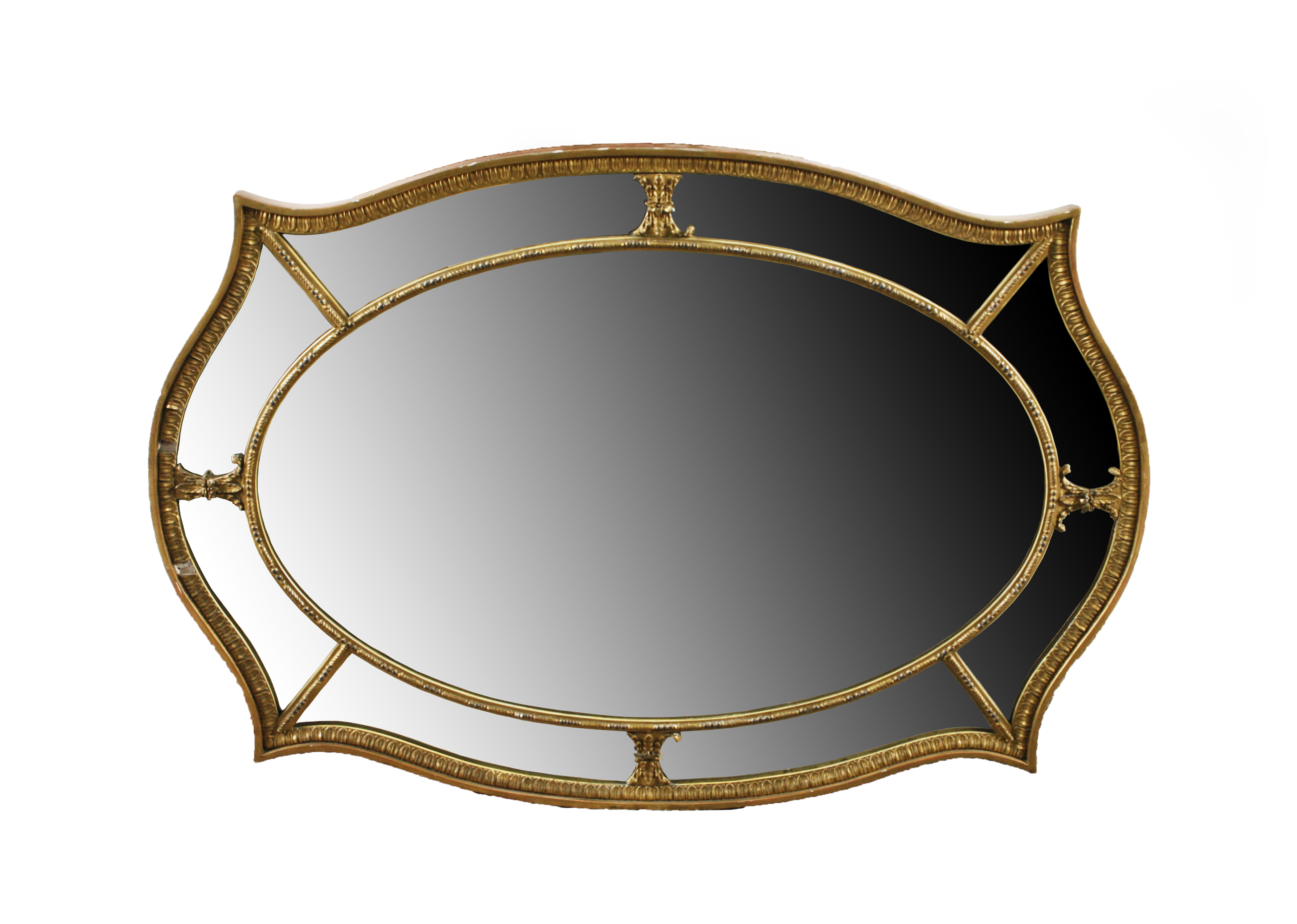 the bevelled oval mirror plate within further margin plates and a gilt wood frame