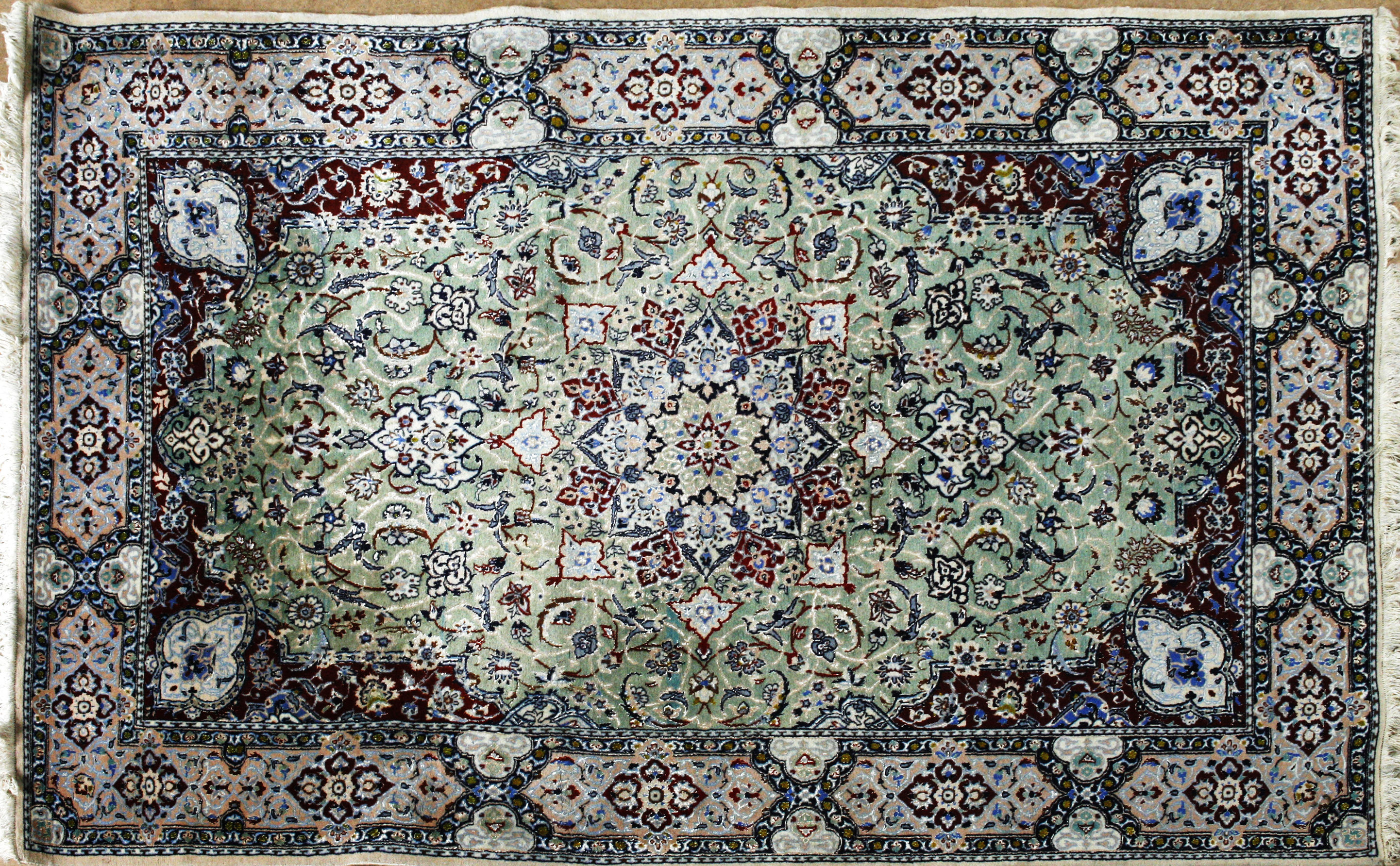 the eau de nil field with central polychrome radiating medallion, red spandrels, within puce cartouche border between bands