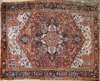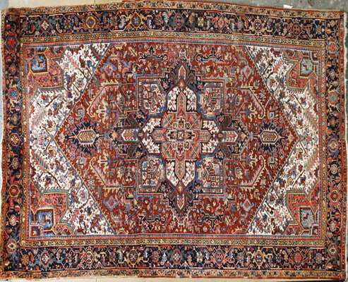 the red field with central indigo, cream and rose medallion, similar spandrels, within indigo turtle palmette and vine border between bands