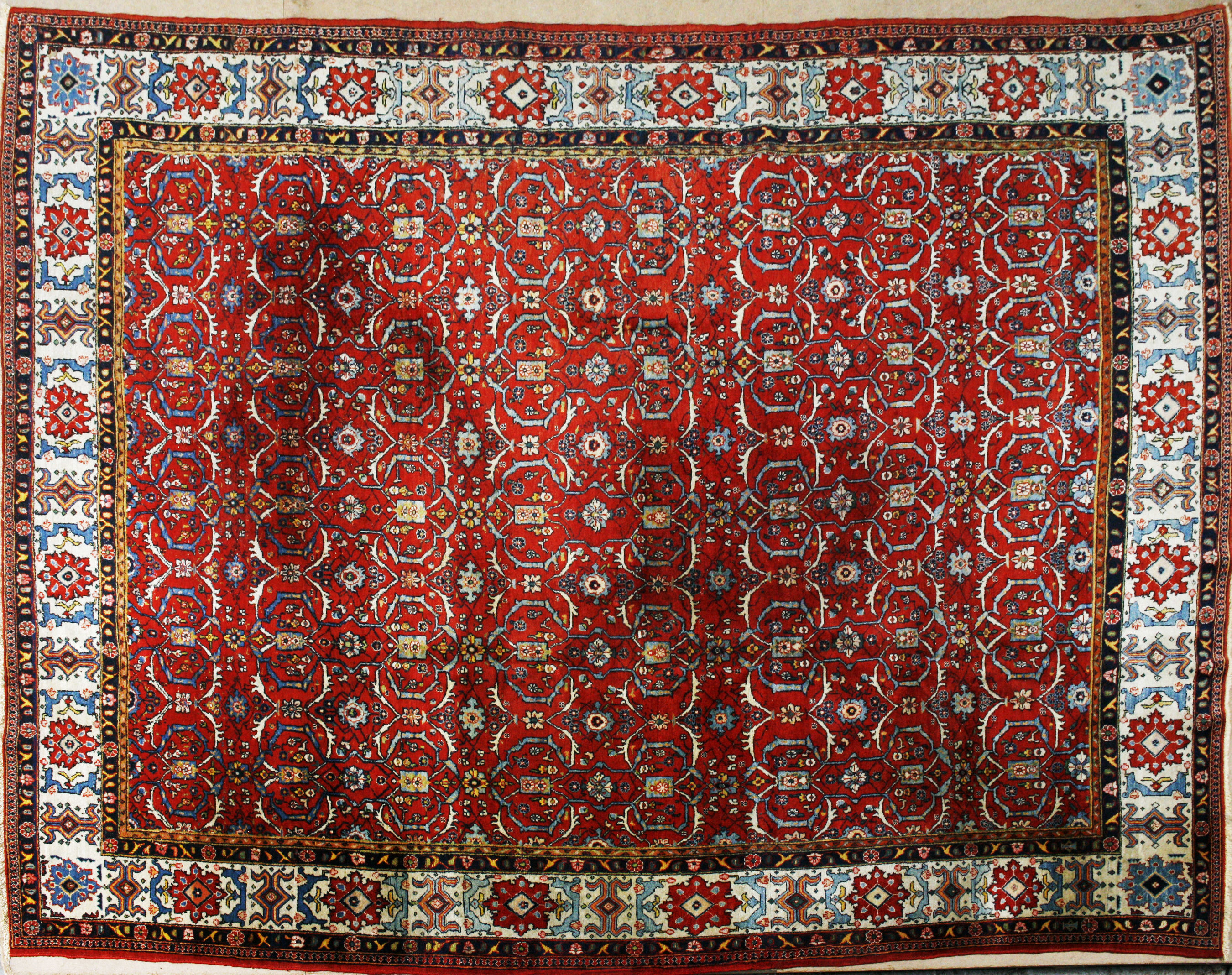 the red field with allover arabesque vine lattice pattern, within cream rosette border between bands.