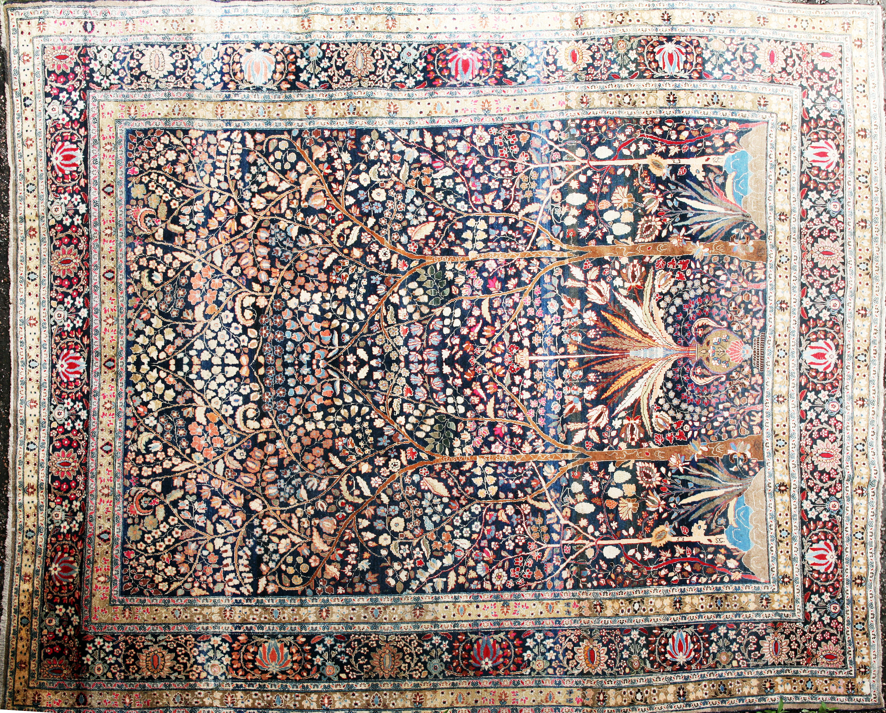 the indigo field with central vase flanked by trees, within indigo palmette and vine border between bands.