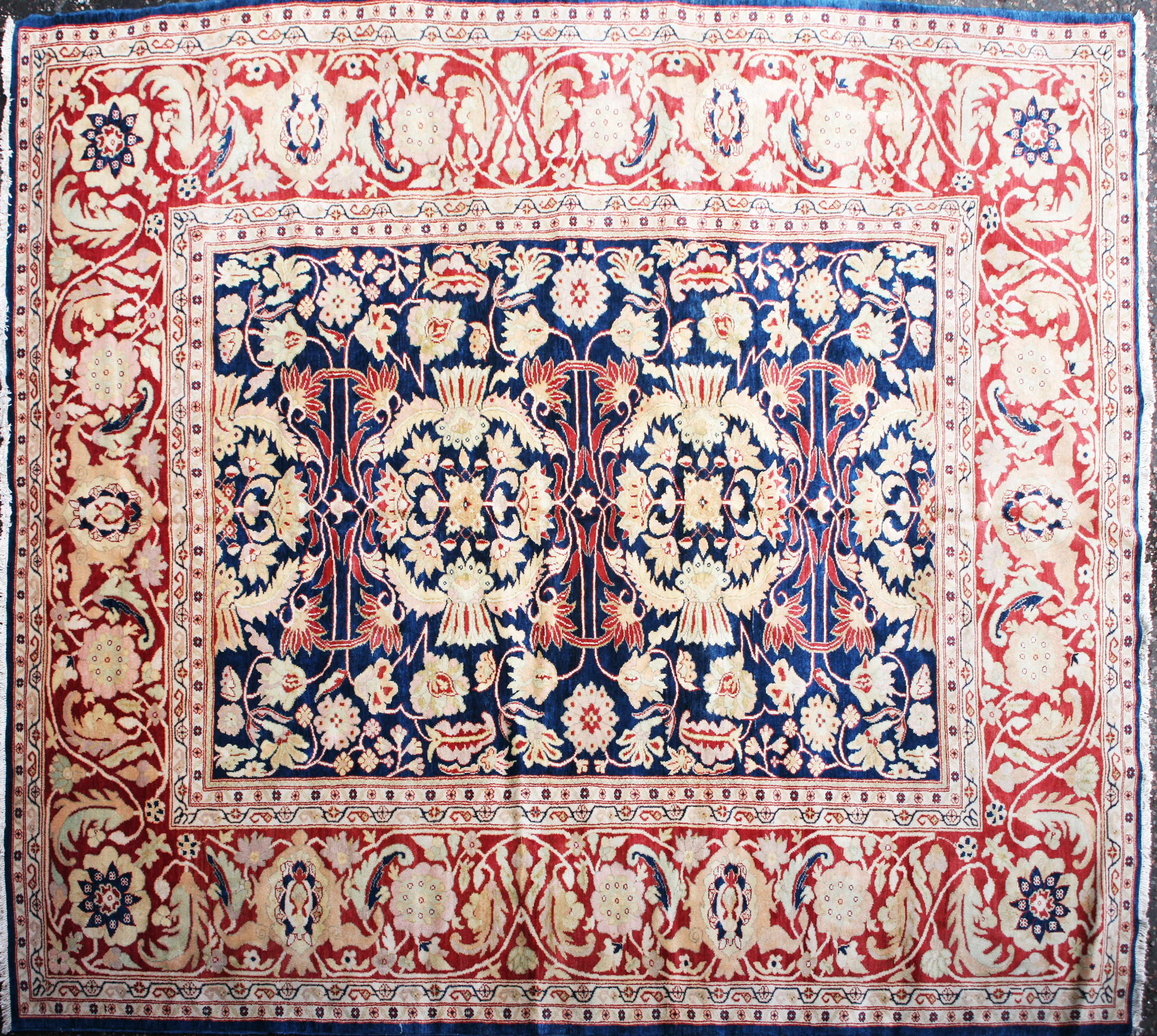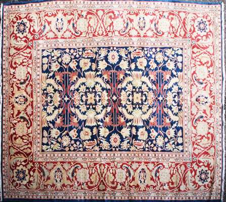 the indigo field with stylised foliate design, within red turtle palmette, rosette and foliate vine border between bands