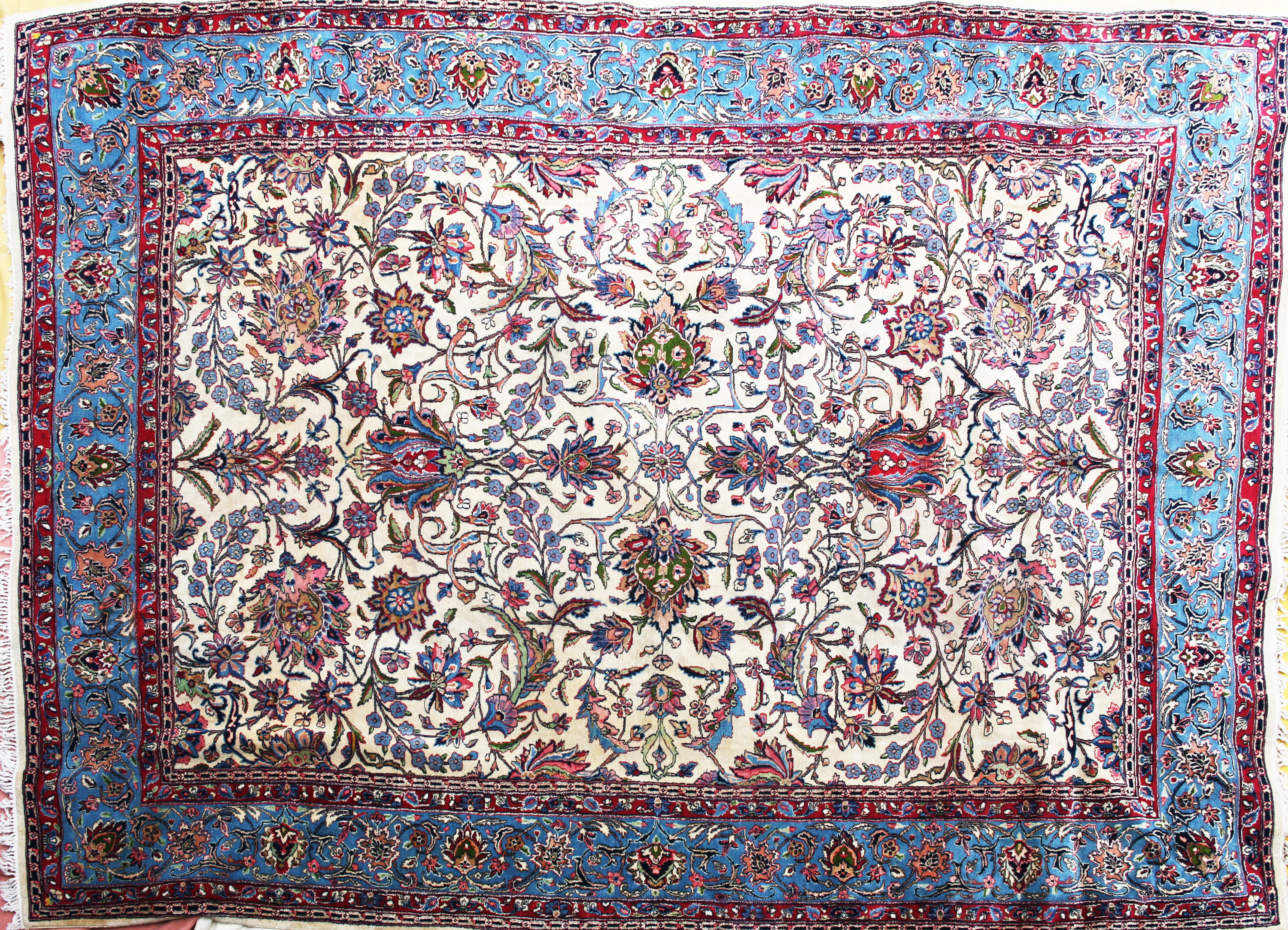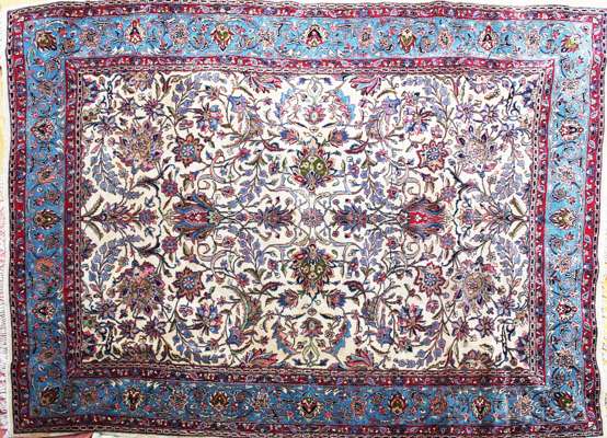 the cream field with allover palmette and scrolling vine pattern, within similar light blue border between bands