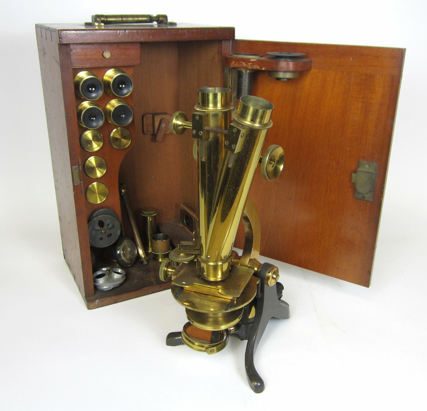 with extra lenses and accessories, in a fitted wooden case