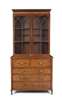 the dentil moulded cornice above a satinwood inlaid frieze above glazed doors with arched astragal panels opening to shelves; the associated lower part with a drop front drawer fitted for writing, over three long graduated drawers, raised on waisted feet