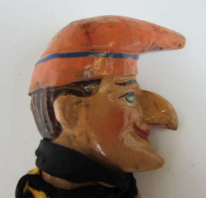 the finial modelled as Mr Punch, decorated with various ribbons and bells, in a textile bag