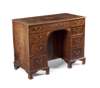 the rectangular top with fan medallion inlay over three short frieze drawers, above a recessed kneehole with a cupboard door, flanked by banks of three drawers, raised on shaped bracket feet