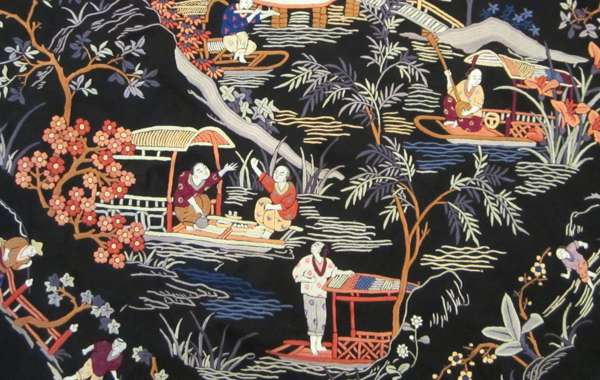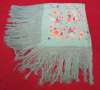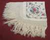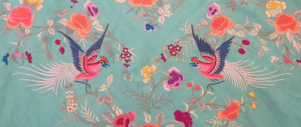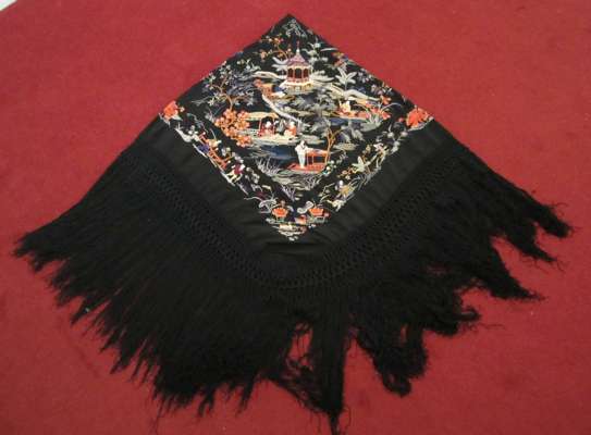 comprising: a green example, embroidered with exotic birds and peonies, with fringing, 130cm squared approx. (excluding fringing); a cream shawl, embroidered with peonies, with fringing, 160 x 150cm approx. (excluding fringing); and a black example, embroidered with figures in boats, with fringing, 150cm squared approx. (excluding fringing) (3)