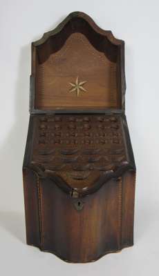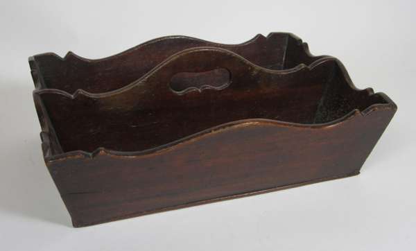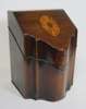 of typical serpentine form, with an inlaid cartouche and banding, the interior fitted, 32cm high; together with a GEORGE III MAHOGANY CUTLERY TRAY, the shaped body with two divisions and a central handle, 36.5cm wide (2)