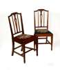the shaped top rail above vertical splats, over a drop in pad seat, raised on square tapering legs and spade feet, united by stretchers (10)
