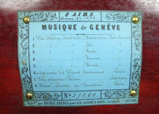 the lever wound cylinder playing on eight airs, stamped with 'Nicole Frères, Geneve' and '37260', the interior with a song card bearing the maker's name and number, all in a stained wooden case with an inlaid motif to the lid