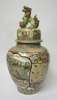 painted in the typical palette with panels depicting warriors, the domed lid surmounted by a fu-lion