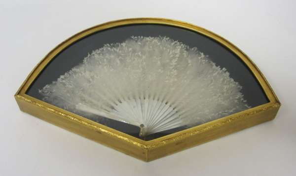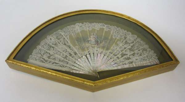 each in a glazed giltwood frame, comprising: a net lace example, frame 63cm wide; a smaller lace fan, with a painted panel depicting a courting couple, frame 50cm wide; and a feather fan, 46cm wide (3)