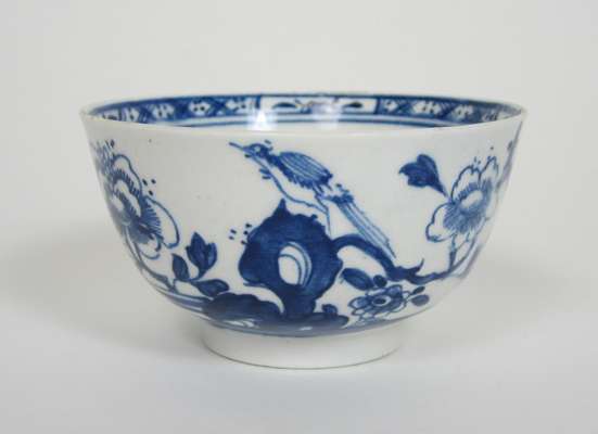 each depicting a Chinese landscape scene, with blue mark to underside, bowl 4cm diam. approx., saucer 7cm diam. approx.; together with a ENGLISH BLUE AND WHITE TEA BOWL, depicting the 'Three Flower' pattern, blue mark to underside, 7.5cm diam. approx.; and a further ENGLISH BLUE AND WHITE TEA BOWL, depicting prunus flowers and birds, 8cm diam. (4)