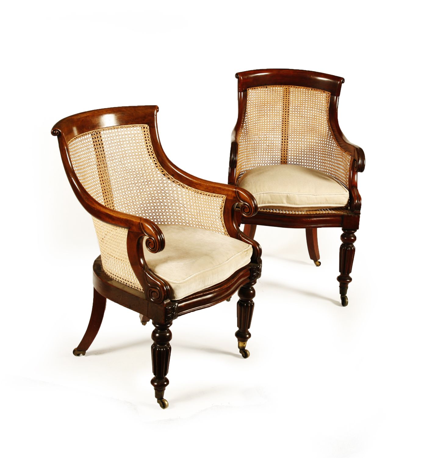 the shaped top rail and caned back above scrolling arms, over a serpentine seat, raised on turned and moulded legs and brass caps and casters