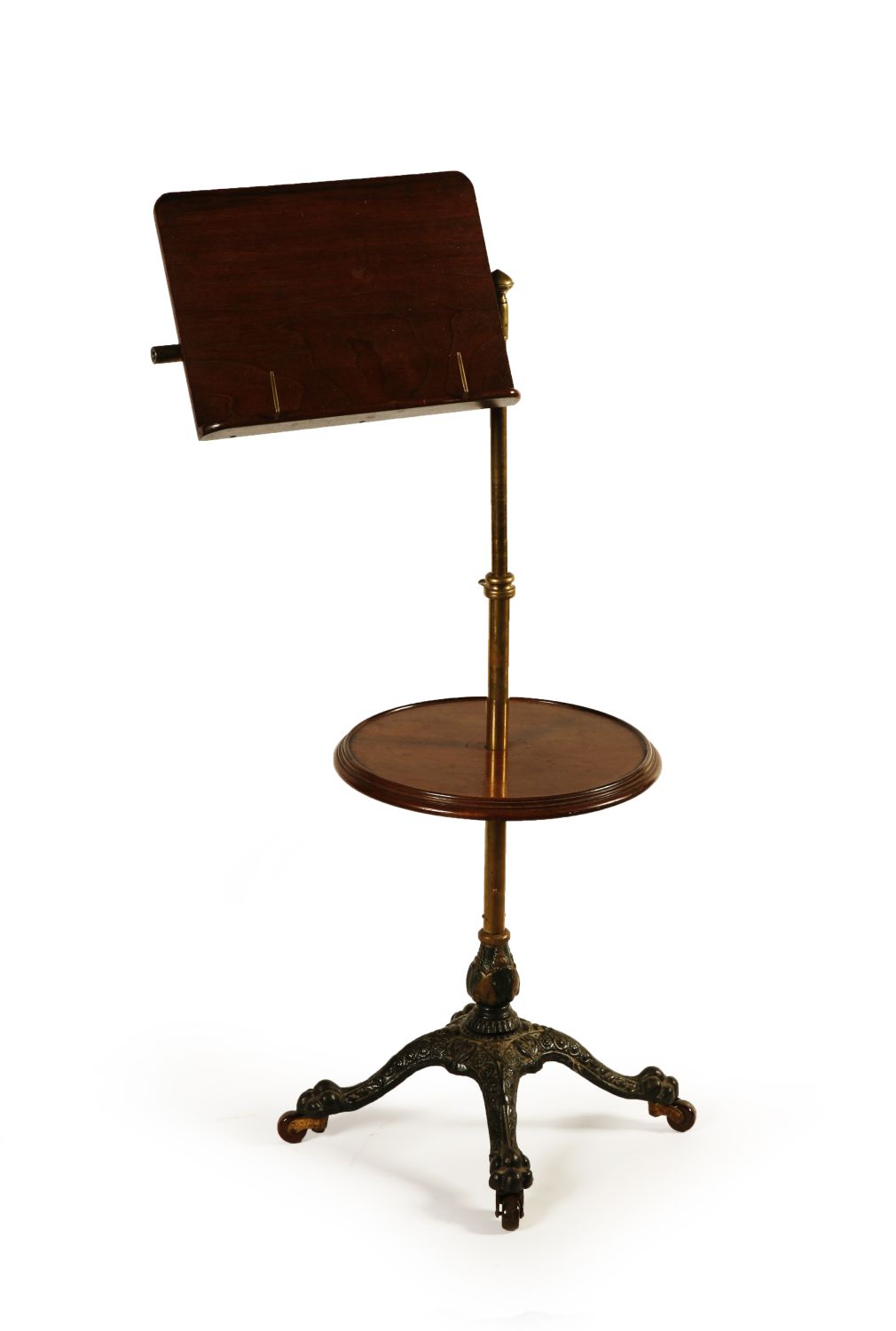 the adjustable book rest above a brass support, over a circular mahogany tier, raised on a cast iron base and ceramic casters