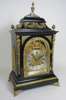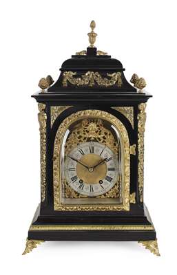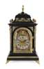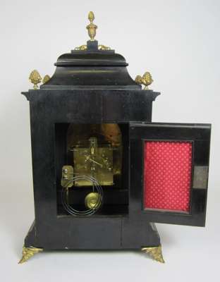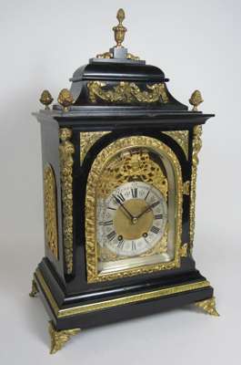 the silvered dial with Roman numerals, in an ebonised and gilt metal mounted case with a moulded top and urn finial, the eight-day movement striking on a gong, raised on four feet