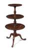 with three graduated circular dished tiers raised and divided by urn form central supports, on tripod cabriole legs ending on pointed pad feet with castors