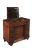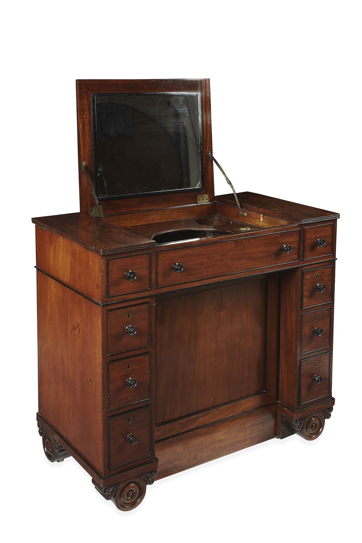 the rectangular hinged top opening to a mirror back over an interior fitted with recesses for a wash bowl and canisters and a brass draining mechanism, above a pair of recessed cupboard doors flanked by banks of short drawers, raised on scroll feet carved with roundels