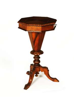 the inlaid octagonal top enclosing a fitted interior above a tapering octagonal support, raised on a carved tripod base