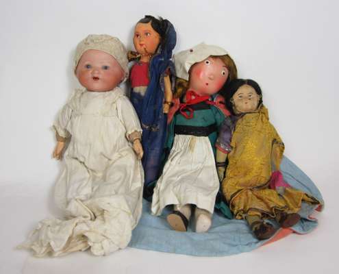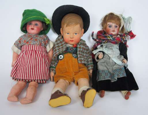 including: a bisque head doll, 'SFBJ 301'; a bisque head doll 'S&H/PB, 1909'; a celluloid Hansel doll; and 11 other dolls (qty)