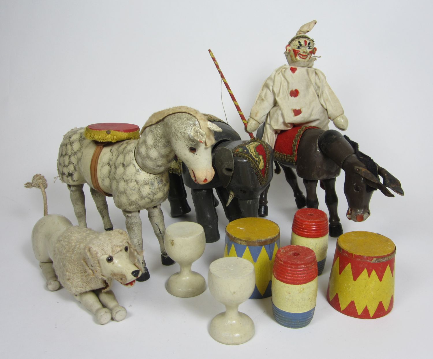comprising of: two clowns; an elephant; a horse; a donkey; a poodle; two ladders; two chairs; two pedestals; two barrels and two goblet shaped pedestals (16)